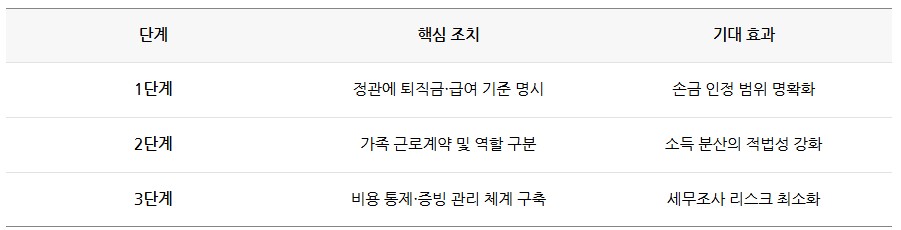 가족 급여, 법인카드, 퇴직금 등이 형식적으로 운영되면 세무 리스크가 발생합니다.