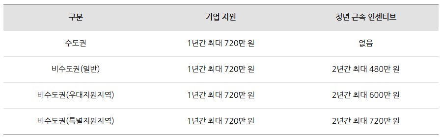 우선지원대상기업·중견기업 : 1인당 연간 최대 720만 원