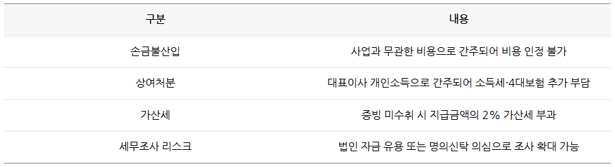 개인적 소비가 섞이면 손금불산입(비용 인정 불가)되며, 대표이사 상여 처분으로 소득세 부담이 생길 수 있습니다.