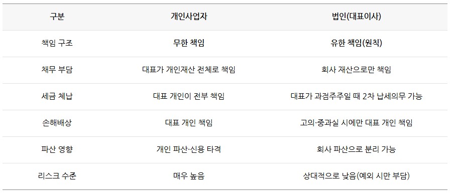 개인사업자 = 대표가 모든 채무·세금·손해에 개인재산 전체로 무한 책임
