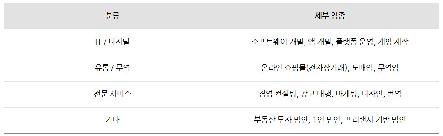특별한 시설 규정이 없고 재택·원격 근무가 용이한 업종은 대부분 문제없이 승인됩니다.