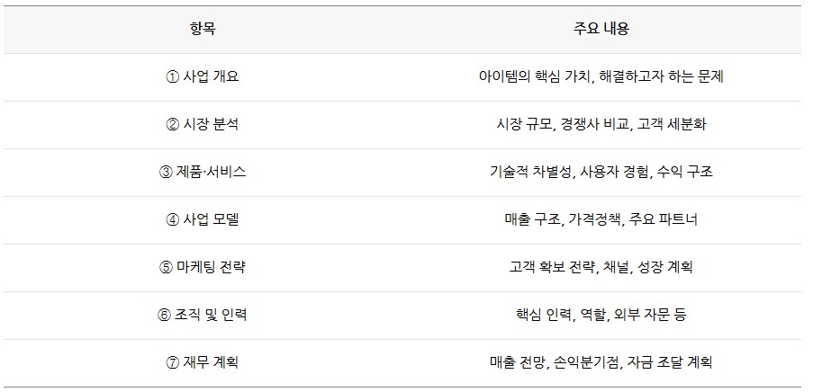 사업 개요 > 시장 분석 > 제품·서비스 > 사업 모델 > 마케팅 전략 > 조직 및 인력 > 재무 계획