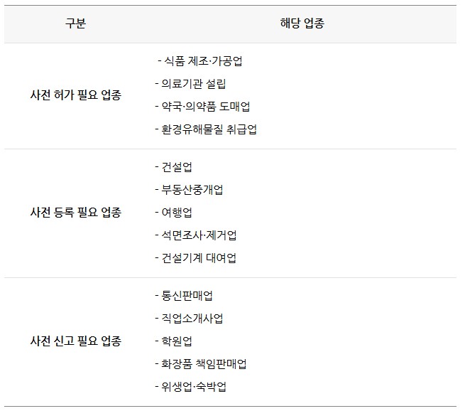 업종별로 요구되는 허가·등록·신고 절차를 정확히 확인해야 합니다.