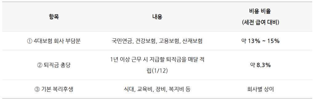 따라서 단순 이해를 위해서는 “급여의 1.25배 안팎이 진짜 비용이다”라고 기억해 두면 충분합니다.