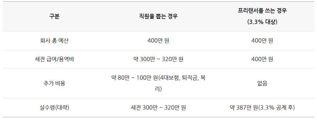 같은 400만 원이라도 직원에게 지급하느냐 프리랜서에게 지급하느냐에 따라 회사의 인건비 구조는 완전히 달라집니다.