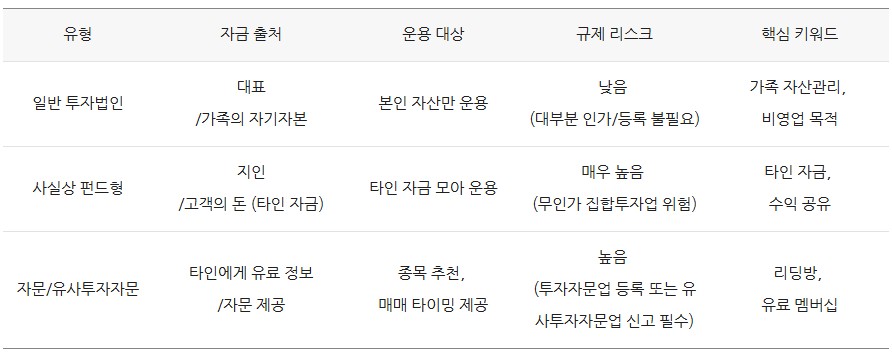⚠️ 주의 : 지인 돈을 모아 운용하는 행위는 무인가 펀드로 간주되어 자본시장법 위반으로 이어질 수 있습니다.