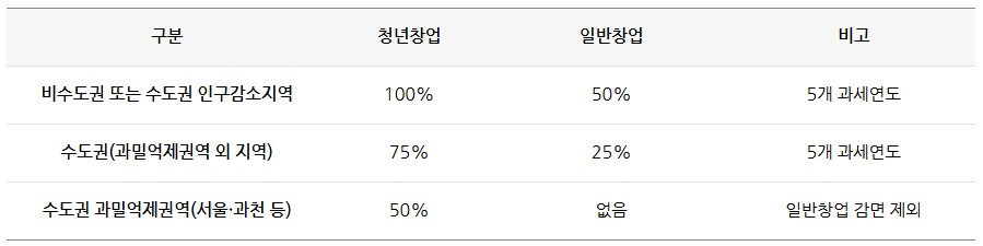 2025년 이후 창업기업은 창업 지역·청년 여부에 따라 아래처럼 감면율이 달라집니다.