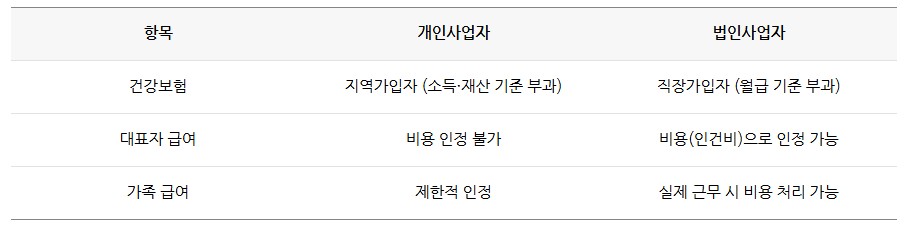 법인은 대표 급여를 비용으로 처리해 절세가 가능하며, 건강보험료도 월급 기준으로 산정되어 소득 대비 부담이 줄어드는 경우가 많습니다.