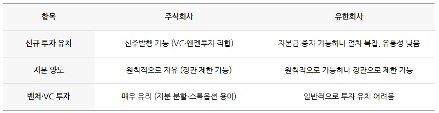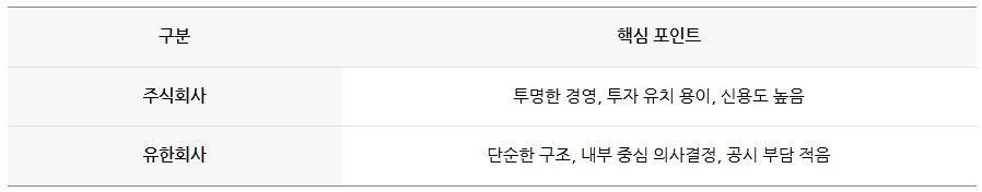 ✅ 유한회사 사원총회 → 이사(대표이사) 체계로 비교적 단순합니다. 의사결정 속도가 빠르지만, 대표 중심 경영이 되기 쉬워 내부 견제 구조는 주식회사보다 단순합니다.