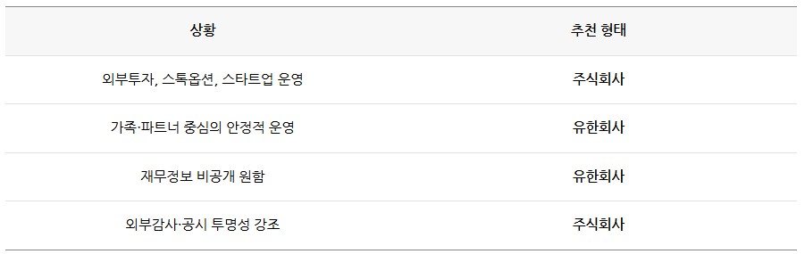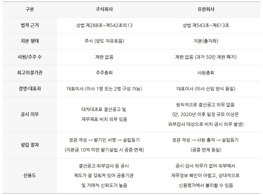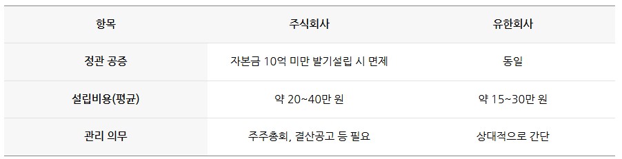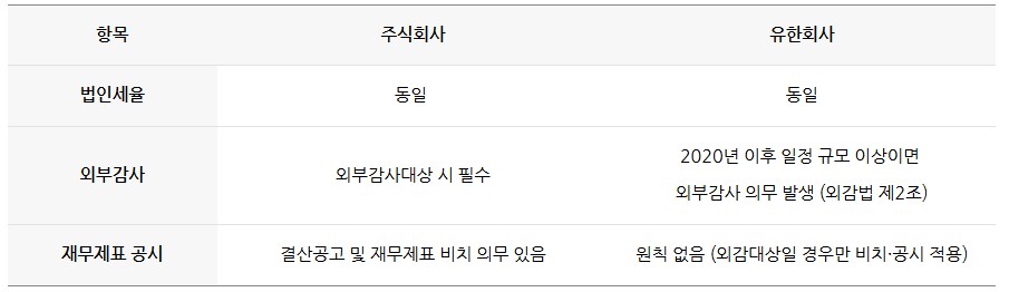 두 형태 모두 세금 부담은 동일하지만, 주식회사는 투명경영을 위한 공시·감사 제도가 더 강화되어 있습니다.