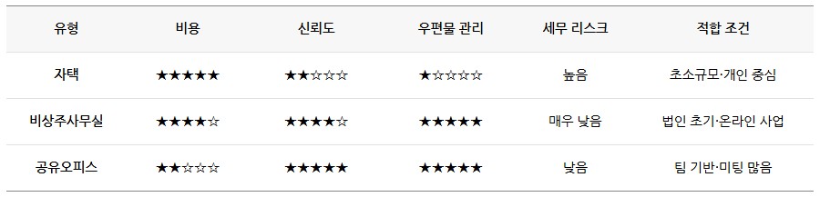 자택, 비상주사무실, 공유오피스—어느 것을 선택하느냐에 따라 월별 비용, 거래처 신뢰도, 은행 계좌 개설 성공률 등이 달라집니다.