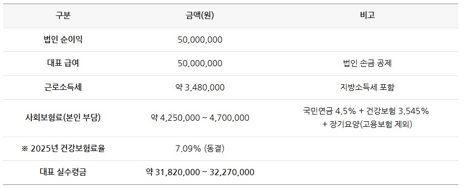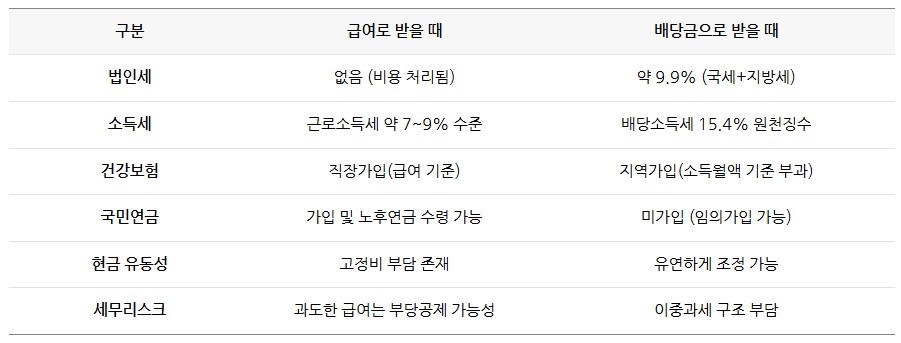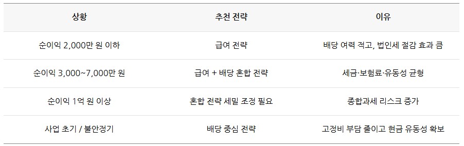 💡 즉, 급여는 “법인세 절감형”, 배당은 “현금 유동성형” 전략입니다.